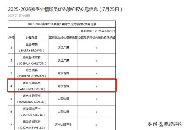 此前,北京男篮上报了奥莫特的优先续约权,若是按照正常的情况,这是北京男篮保留奥莫特的信号,或者是通过交易的方式送到其他球队效力,否则是不太可能会没有考虑的方式继续保留奥莫特的签约权。